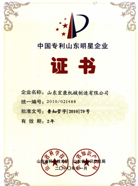 中国专利山东明星企业证书