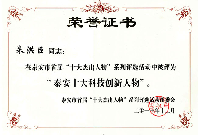 1月6日,由泰安市工商联、市科技局、市商务局、市经济合作局、市电视台共同举办的泰安市首届“十大杰出人物”系列评选活动颁奖典礼在泰安广播电视台隆重举行。公司董事长、总经理康凤明被评为“泰安市突出贡献人物”。副总经理朱洪臣被评为 “泰安十大科技创新人物”称号。泰安市委常委、宣传部部长张志华,泰安市人大副主任杜卓群,泰安市政协副主席、市工商联主席张庆明,出席活动并为获奖的“十大杰出人物”颁奖。