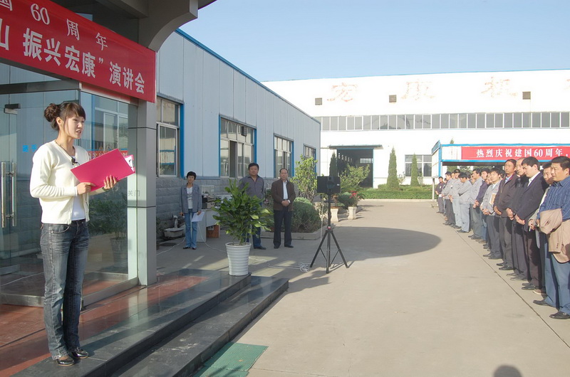 金秋送爽,举国欢腾。在建国60周年来临之际,9月21日至22日,公司工会、团委利用班前会的形式,联合举办了“爱我中华,情系泰山,振兴宏康”演讲活动。广大员工积极参加演讲,联系自身实际,讴歌祖国的巨大变化和宏康公司的快速发展,并以百倍的信心和实际行动,做好本职工作向祖国献礼。