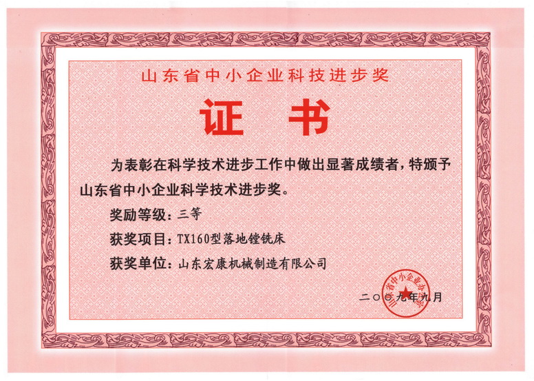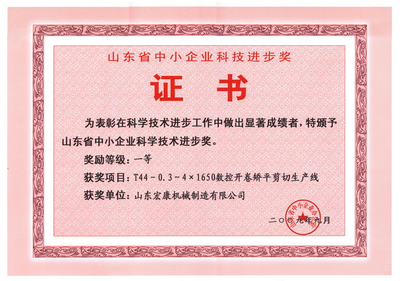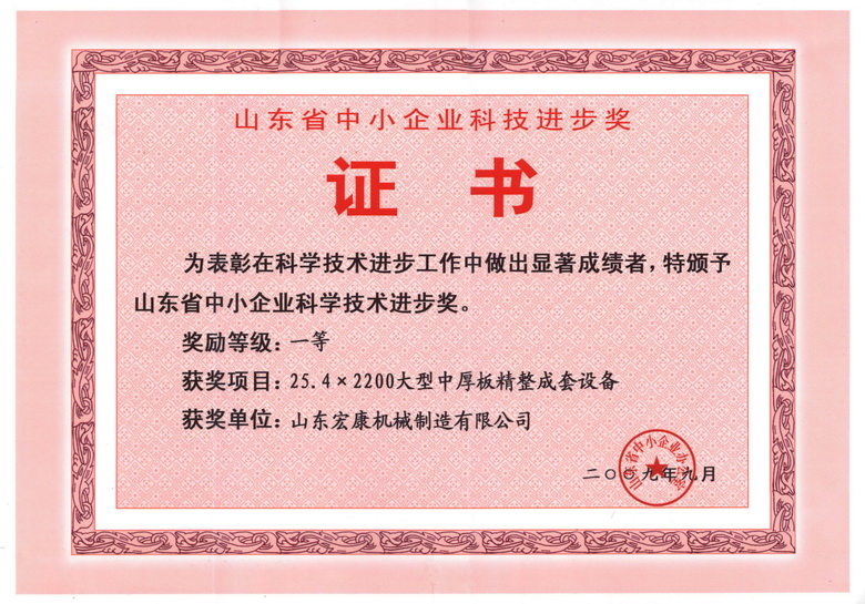 公司三项科技成果荣获2009年山东省中小企业科技进步奖,其中“25.4×2200大型中厚板精整成套设备”和“T44-0.3~4×1650米乐电竞官方网站(中国)有限公司官网”两个项目获一等奖;“TX160型落地镗铣床”项目获三等奖。