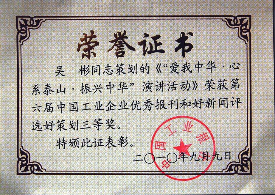 《山东宏康》荣获第六届中国工业企业优秀报刊三等奖;吴斌同志策划的《“爱我中华.心系泰山.振兴中华”演讲活动》荣获第六届中国工业企业优秀报刊和好新闻评选策划三等奖。